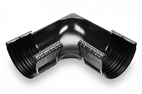Черный цвет внутреннего угла 90° для желоба 152 мм STAL придает ему универсальность и эстетичность. Он легко сочетается с различными цветовыми решениями фасадов и кровель, что делает его незаменимым элементом в системе водоотвода.